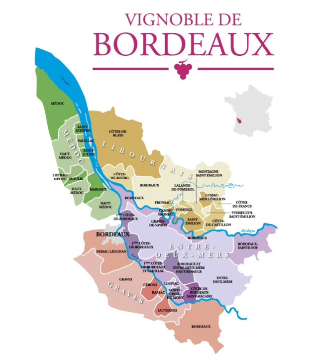 보르도 주요 와인 생산지역은 지롱드 강 하구를 기준으로, 크게 레프트 뱅크(Left Bank)와 라이트 뱅크(Right Bank)로 나누어지며, 각각 독특한 특성과 와인 스타일을 가지고 있다. 레프트 뱅크는 카베르네 소비뇽 중심의 강건하고 탄탄한 와인이, 라이트 뱅크는 메를로 중심의 부드럽고 과일 향이 풍성한 와인이 주를 이루며, 쏘테른 등 일부 지역에서는 스위트 화이트 와인이 유명하다.